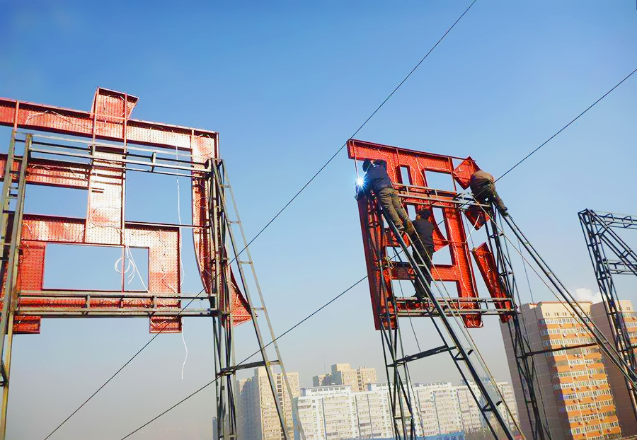 外露发光字由两部分组成:一个金属冲孔字,另一个是LED光源。发光字是由打好孔的字壳,和单色外漏灯组成。把整张的板材在机床上冲孔,再根据字形切割出来,焊好立体边,打磨,烤漆处理,再把LED灯装在冲好的孔上。 字形切割采用高精度等离子切割,立体边使用专业的勾槽机勾角处理,并采用优质汽车漆烤制而成。